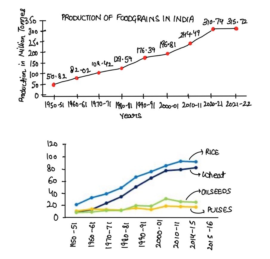 In the 1960s, India faced recurring famines and food shortages, leading to dependence on imports like PL-480 wheat from the US. However, by 2022–23, India had become the 2nd largest producer of rice and wheat and a significant net exporter of foodgrains, reflecting a structural transformation in its agricultural economy.