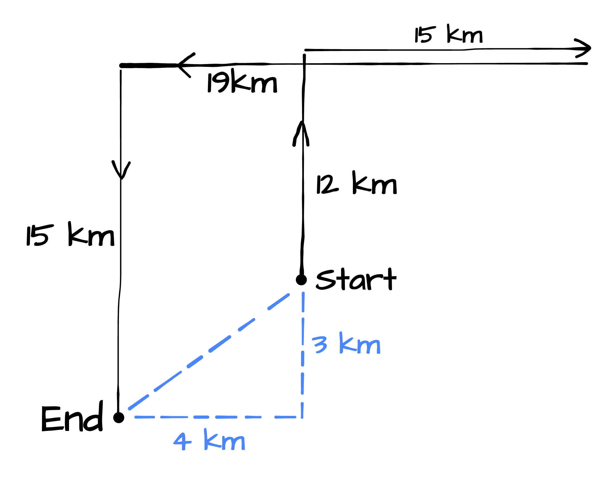 A person walks 12 km due north, then 15 km due east, after that 19 km due west and then 15 km due south. How far is the from the starting point?