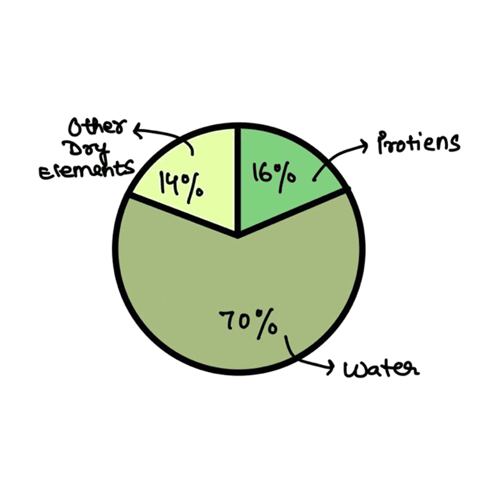 A pie diagram shows the percentage distribution of proteins, water and other dry elements in the human body. Given that proteins correspond to and water corresponds to . If both proteins and the other dry elements correspond to , then what is the central angle of the sector representing on the pie diagram?