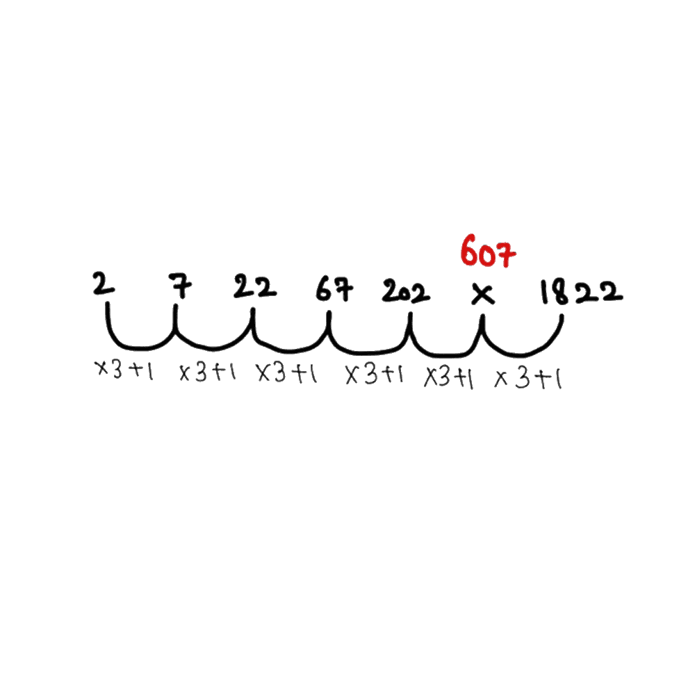 What is the value of ‘X’ in the sequence 2, 7, 22, 67, 202, X, 1822?