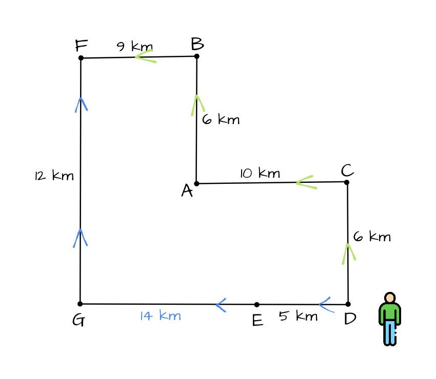 There are 7 places A, B, C, D, E, F and G in a city connected by various roads AB, AC, CD, DE, BF, EG and FG. A is 6 km south of B. A is 10 km west of C. D is 5 km east of E. C is 6 km north of D. F is 9 km west of B. F is 12 km north of G. A person travels from D to F through these roads. What is the distance covered by the person ?